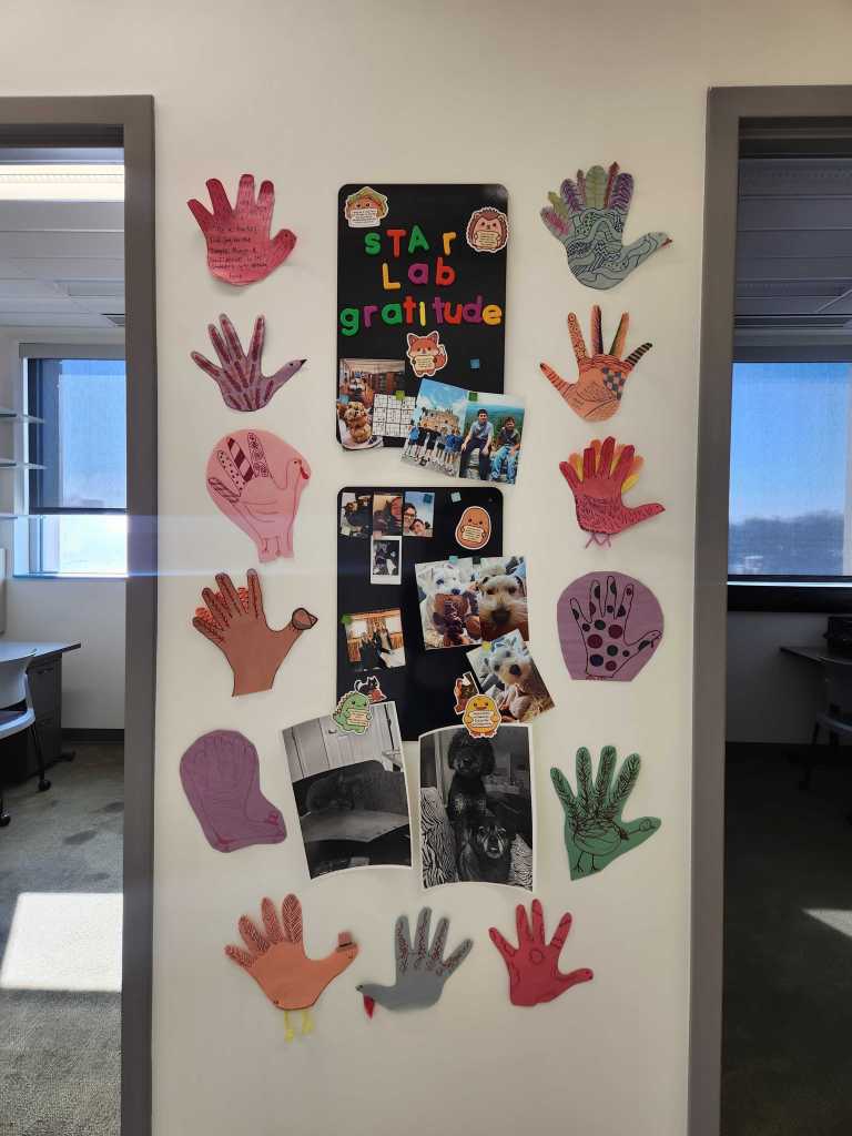 Our lab meetings hold journal clubs on a wide range of topics. For November of 2025, we dedicated a day to gratitude by hosting a journal club on empirical evidence for the use of gratitude in health services, a potluck of lab members favorite foods, and the creation of the star lab gratitude wall complete with hand turkeys from our members.