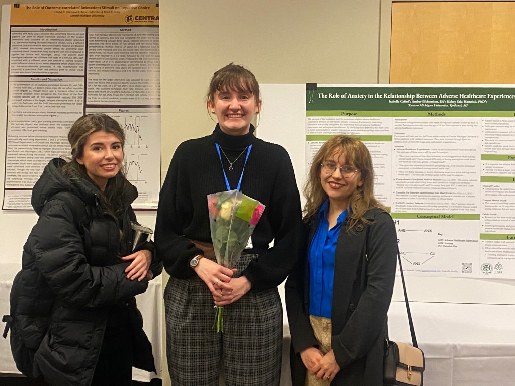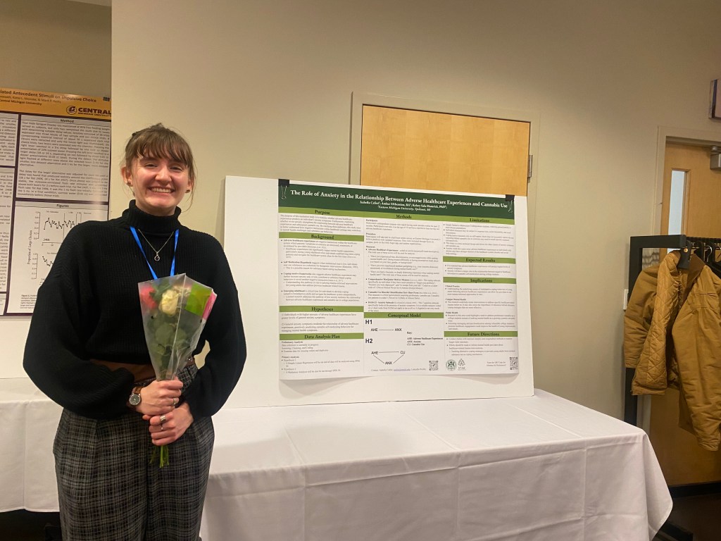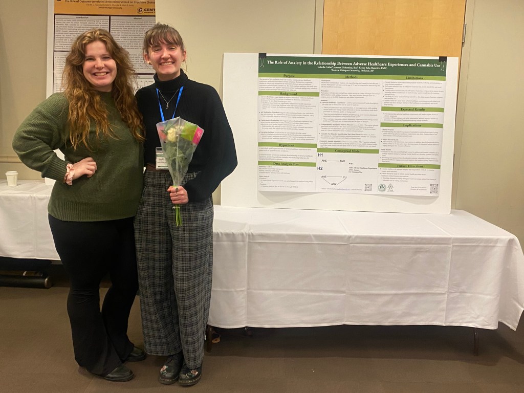 In February 2026, Isabella Cafini presented her findings from the Experiences Seeking Healthcare study at EMU’s very own Behavior Analysis Association of Michigan conference! Her poster, The Role of Anxiety in the Relationship Between Adverse Healthcare Experiences and Cannabis Use, summarized her goals for her honors thesis at EMU.